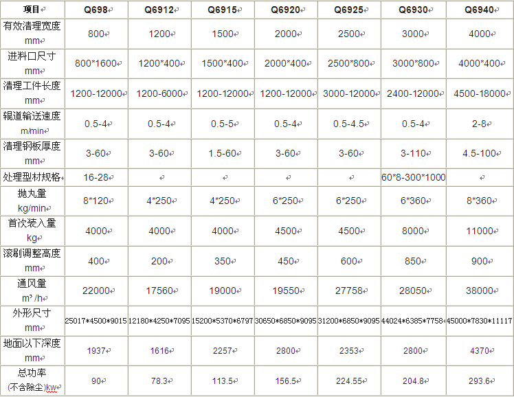 二、輥道通過(guò)式拋丸機(jī)參數(shù)